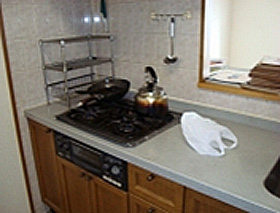 クロス、カーペット、クッションフロア、扉の傷を隠すためダイノックシートで化粧しました。また、出窓の面台もヤケがひどく変色していたため、同じくシートで化粧しました。キッチンは蛇口の取替えも行っています。
